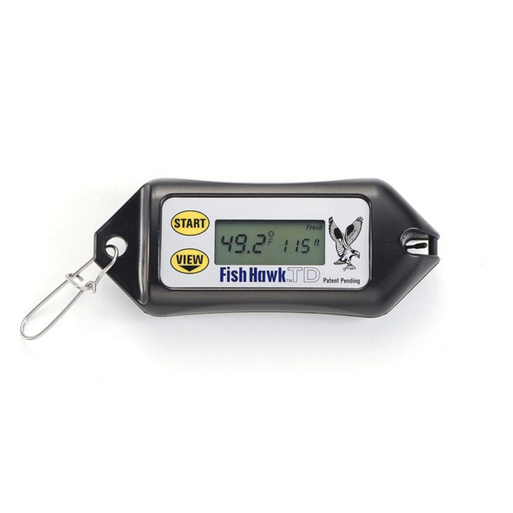 Thanks to highly accurate temperature and water-pressure sensors, the Fish Hawk TD provides a temperature profile of the entire water column. Simply attach the it to a fishing line or downrigger cable. As the Fish Hawk TD is lowered through the water, a temperature reading is taken every 5-feet. After retrieving it water temperature and depth information is displayed on the built-in LCD screen (5’, 10’, 15’, 20’, 25’ etc…) Temperature and depth data is stored in memory until the TD is used in the water again.